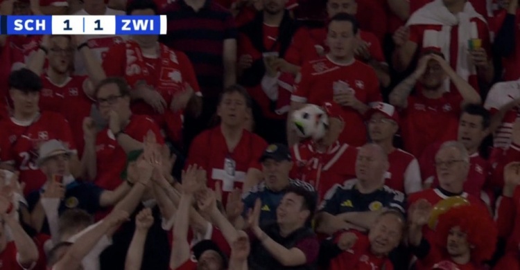 6月20日讯 欧洲杯小组赛A组第2轮,瑞士1-1战平苏格兰。比赛第78分钟,瑞士前锋恩多耶内切打门射上看台,球门后方的瑞士球迷伸手挡球,皮球反弹后正中附近一名老球