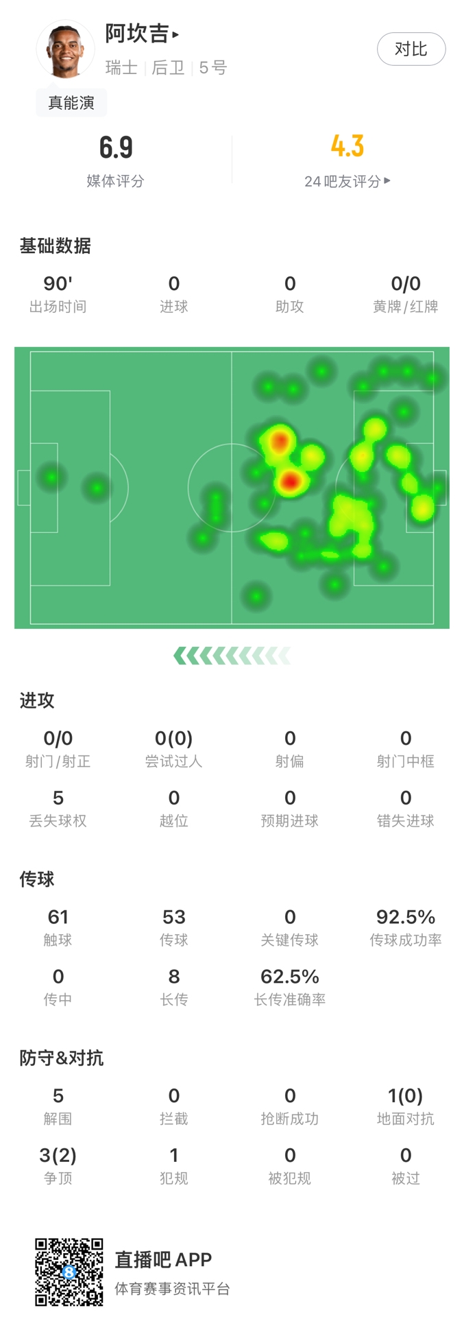 阿坎吉全场5次解围,6次抢回球权,3次争顶2次成功,53次传球,成功率92.5%。