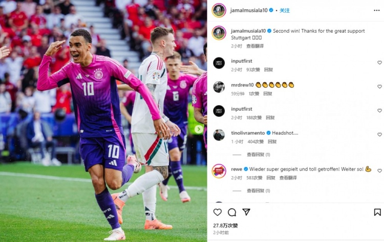 6月20日讯 德国在本轮欧洲杯2-0击败匈牙利,首开记录的穆西亚拉在赛后通过社媒纪念胜利。
