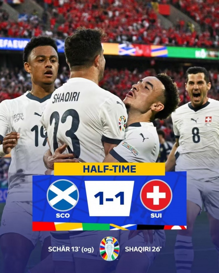 6月20日讯 欧洲杯小组赛A组第2轮,苏格兰对阵瑞士。上半场,麦克托米奈破门,沙奇里无解世界波扳平,恩多耶破门被吹越位在先。半场战罢,苏格兰1-1瑞士。