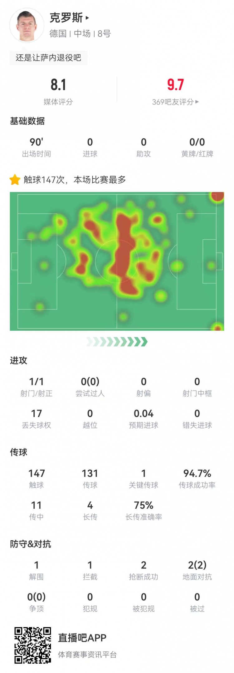 克罗斯本场数据:131次传球124次成功+1关键传球,获评8.1分