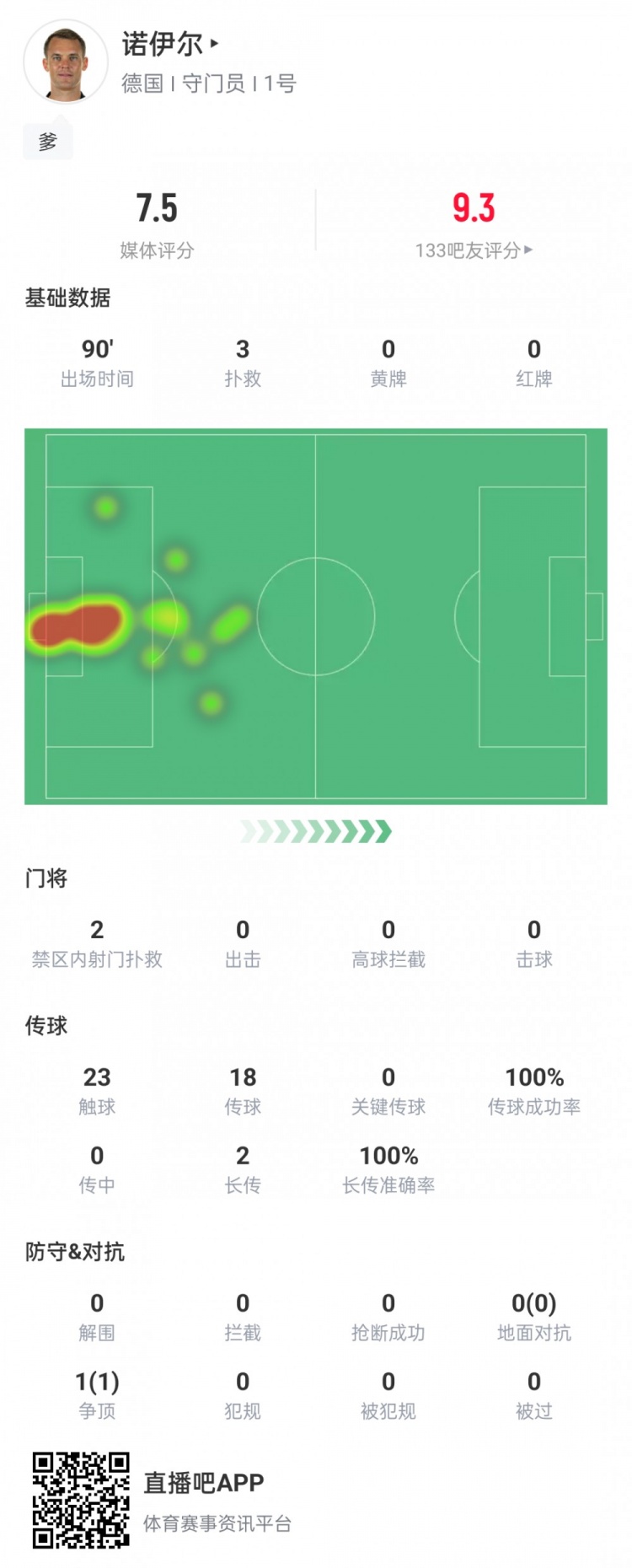 诺伊尔数据:3次扑救力保球门不失,传球成功率100%,获评7.5分