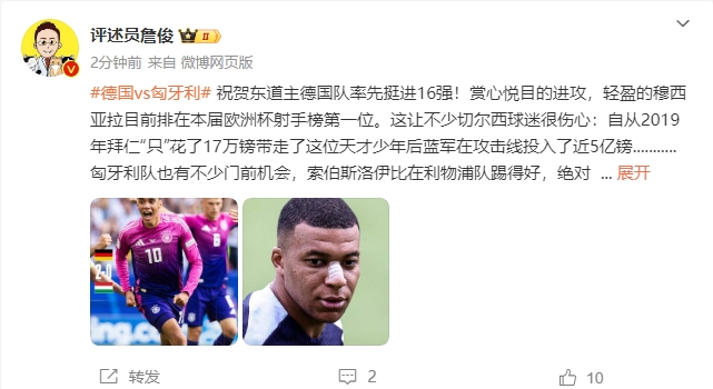 06月20日讯 欧洲杯第二轮,德国2-0匈牙利提前出线。赛后,评述员詹俊发文。