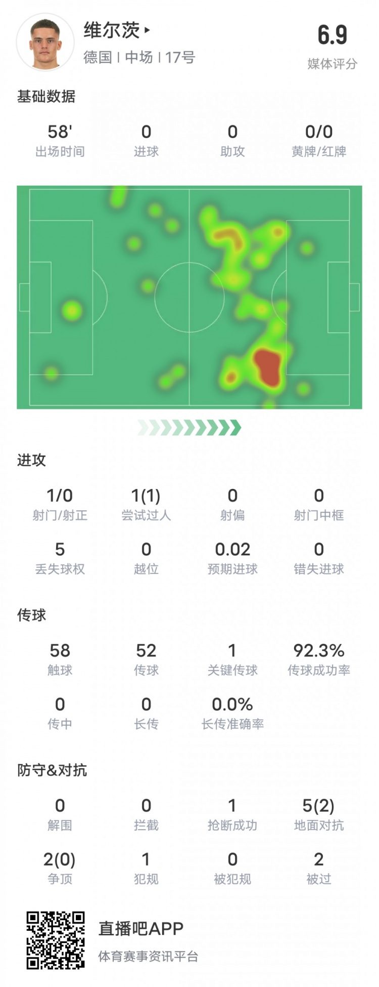 维尔茨本场数据:1过人成功1关键传球&传球成功率92.3%,评分6.9