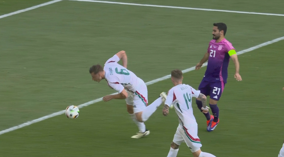 06月20日讯 德国vs匈牙利第25分钟,京多安助攻穆西亚拉破门,但是这次进攻原本是匈牙利后卫奥尔班持球,京多安从后一撞,奥尔班失去平衡倒地,球权易主后形成乱战,最终穆西亚拉破门。