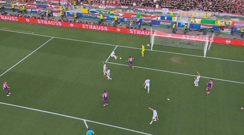 奥尔班倒地瞬间,匈牙利防线全部回头看裁判,示意犯规,但裁判没有响哨。
