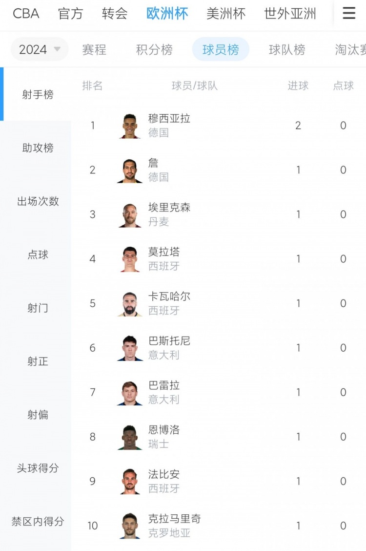 穆西亚拉打进了本届欧洲杯个人第2粒进球,成为本届欧洲杯首位打进2球的球员,终于有人独自领跑射手榜了