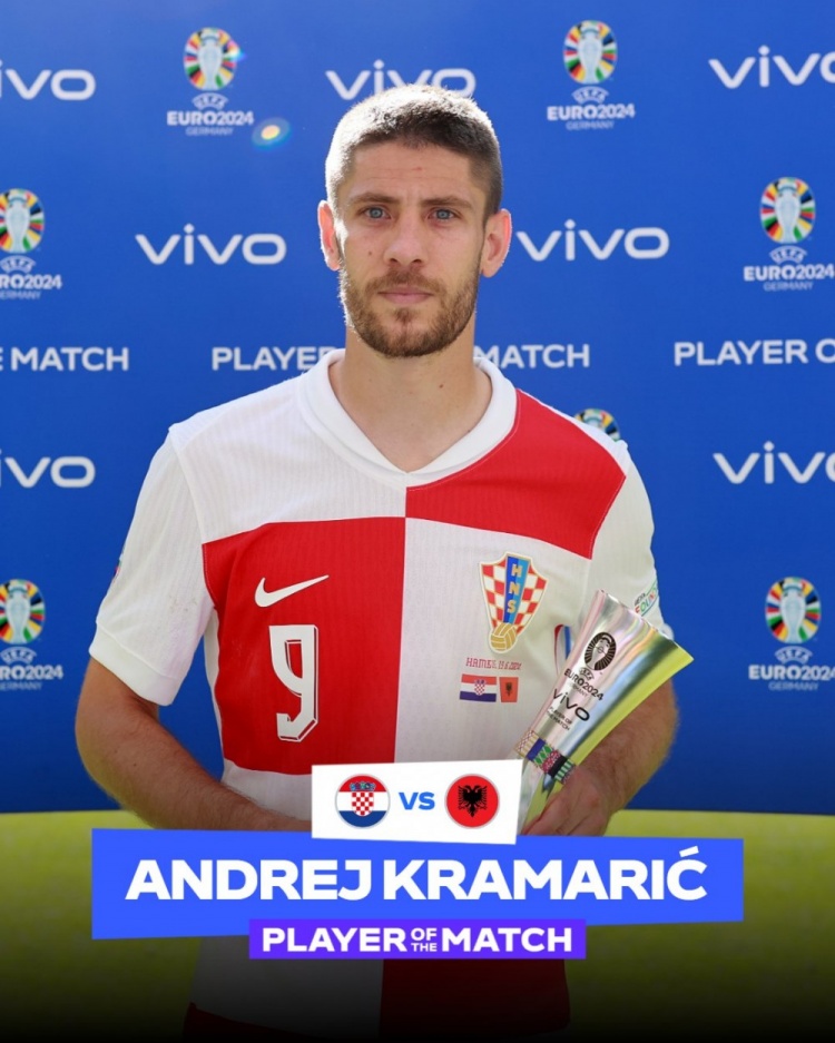6月20日讯 欧洲杯小组赛B组第2轮,克罗地亚2-2战平阿尔巴尼亚,今天过33岁生日的前锋克拉马里奇当选全场最佳球员。