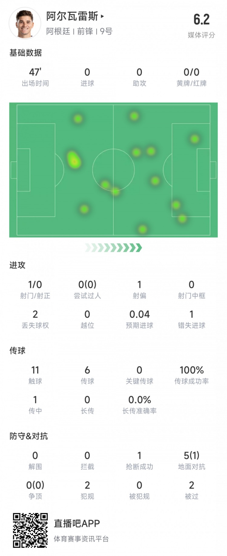 阿尔瓦雷斯上半场数据:5次对抗1次成功,错失1次进球机会