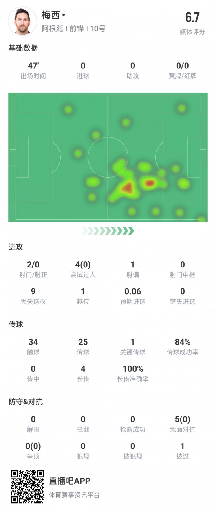 梅西揭幕战半场数据:0射正,过人&对抗0成功,4次长传全部成功
