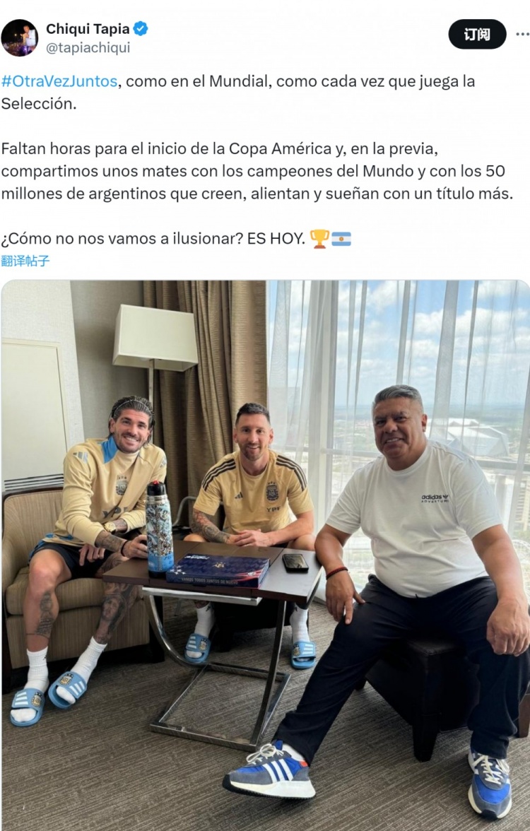 “距离美洲杯开赛还有几个小时,在这段时间里,我们与世界杯冠军以及5000万阿根廷人一起,相信、鼓励并梦想着再次赢得冠军。”