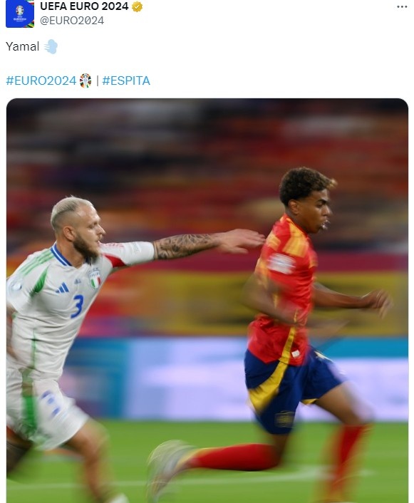 欧洲杯官推也晒出了一张“世界名画”级照片:亚马尔在前方跑出残影,身后的迪马尔科伸出手臂似乎也难以追上年轻的西班牙边锋。