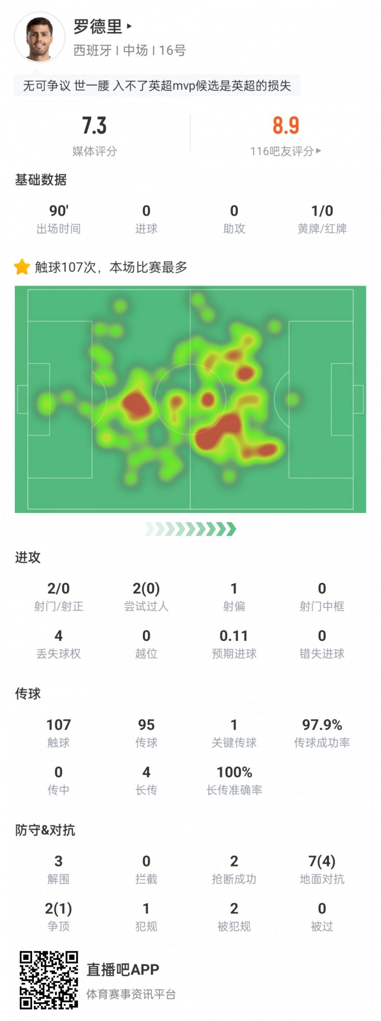 罗德里打满全场,本场数据如下: