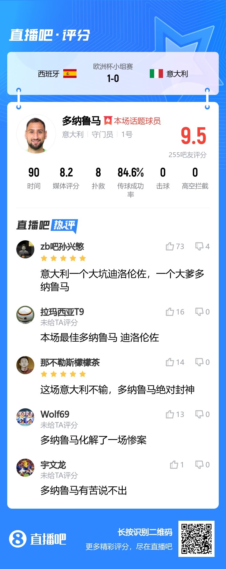 9.5分!吧友评多纳鲁马:他化解了一场惨案;意大利不输他封神