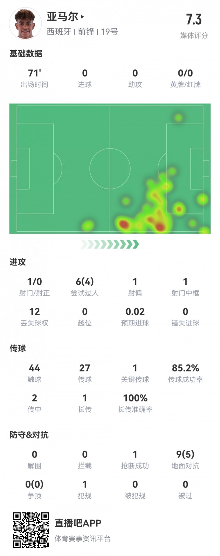 6月21日讯 正在进行的欧洲杯小组赛焦点大战,西班牙暂1-0意大利。此役16岁亚马尔首发出场71分钟被换下,球员全场重点数据如下↓
