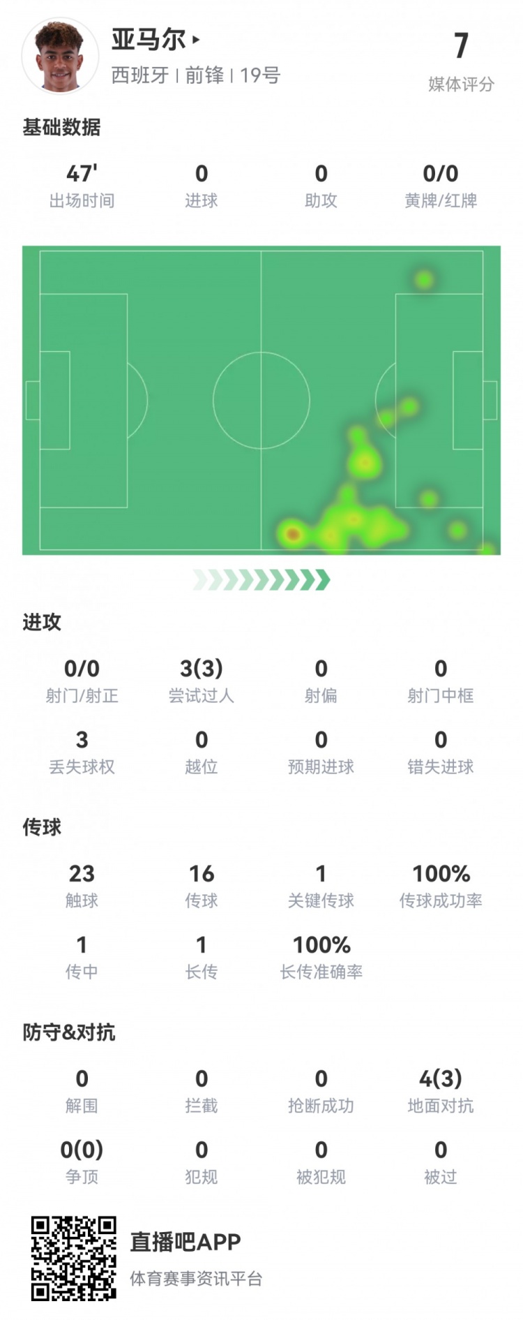 16岁亚马尔半场数据:0射0正,3次过人均成功,1次关键传球