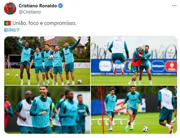 6月21日讯 北京时间6月23日0点,欧洲杯F组第2轮,葡萄牙将对阵土耳其,两队首轮都拿下3分。赛前,C罗更新社媒晒出训练照,配文:“