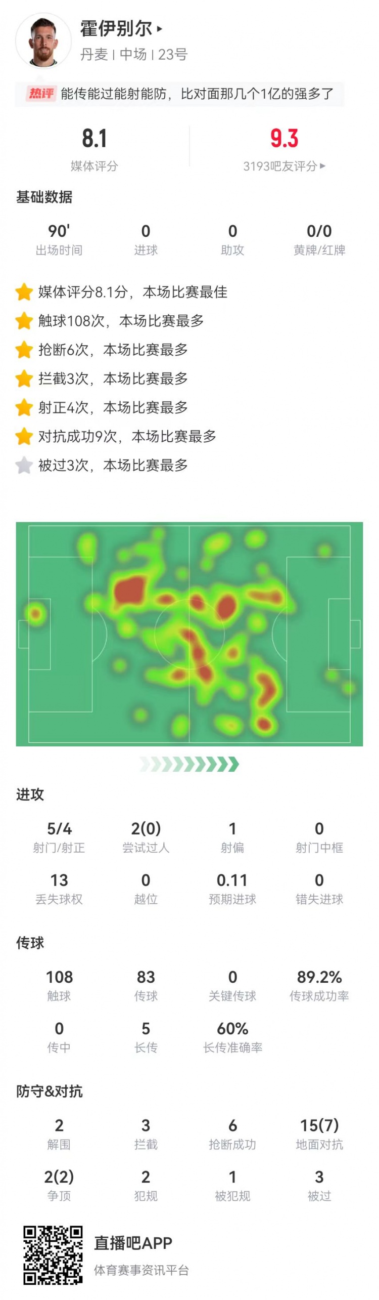 压制!霍伊别尔本场数据:2解围3拦截6抢断 5射4正 8.1分全场最高