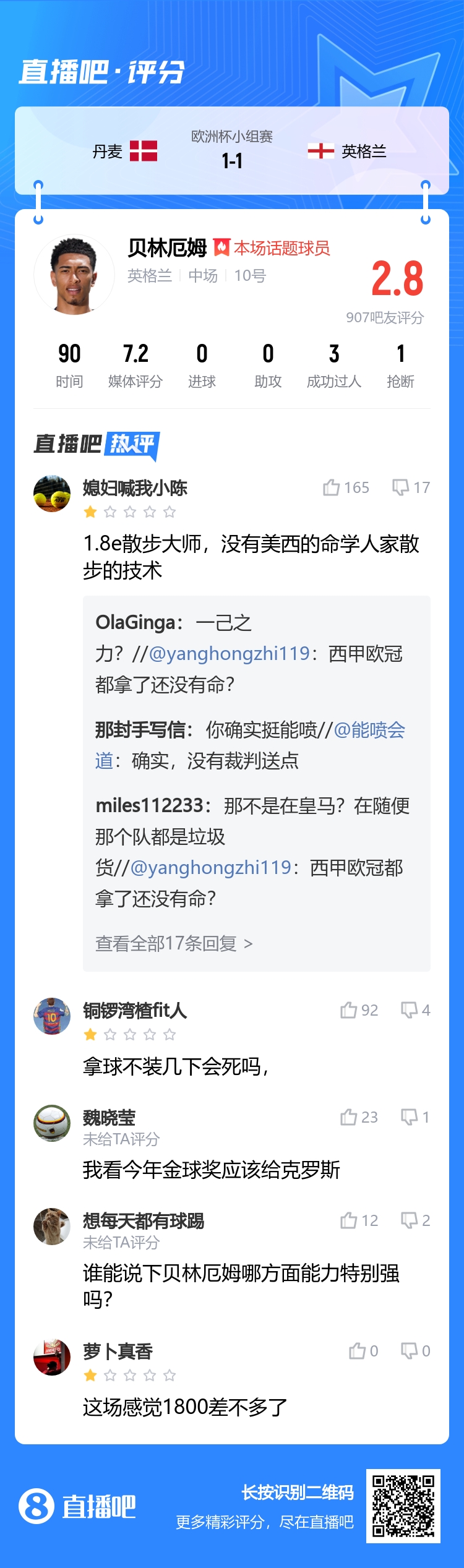 06月21日讯 欧洲杯C组第二轮,英格兰1-1丹麦。赛后吧友仅给贝林厄姆打出2.8分。