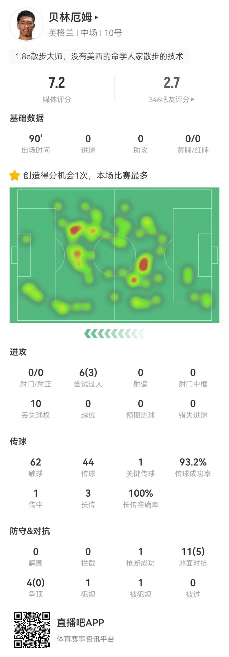 贝林厄姆本场数据:1次造良机+15次对抗5成功,获评7.2分