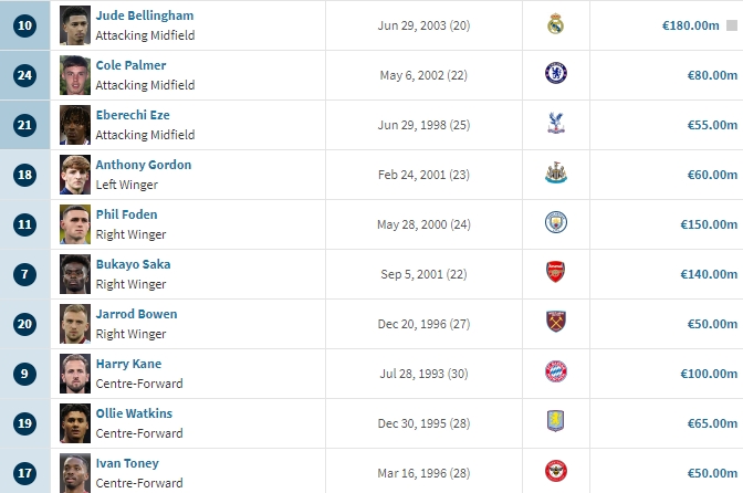 本届欧洲杯英格兰几乎拥有着全欧最豪华进攻线,10人总身价高达9.3亿欧,截止目前只打进2球的表现令人失望。