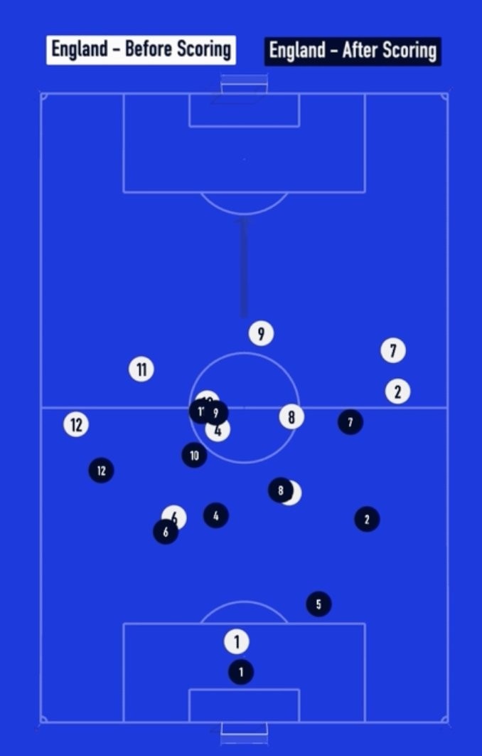 BBC对比了英格兰队进球前后的平均站位,进球前英格兰队4人平均站位完全压过半场,而在进球后英格兰队全队回收半场,无人平均站位完全过半场。