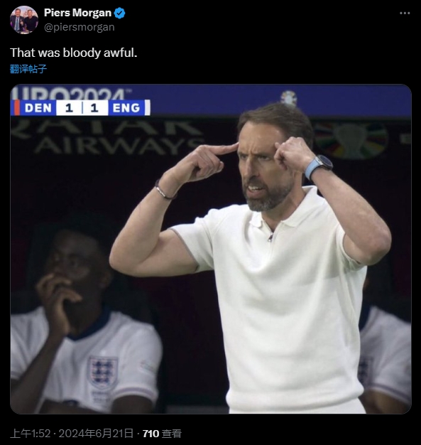 6月21日讯 英格兰在本轮欧洲杯1-1逼平丹麦,诸多名将均未能展现出符合身价的表现。英格兰名嘴摩根也晒出了一张比赛过程中英格兰主帅索斯盖特手指脑门的照片