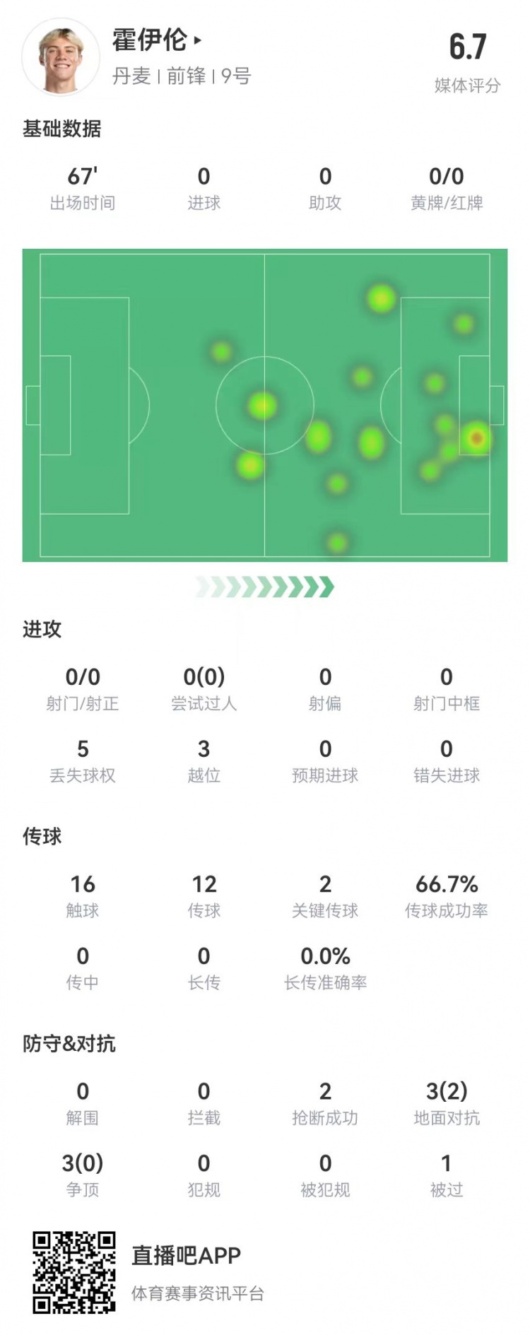 霍伊伦本场数据:0射门3越位+2关键传球,获评6.7分