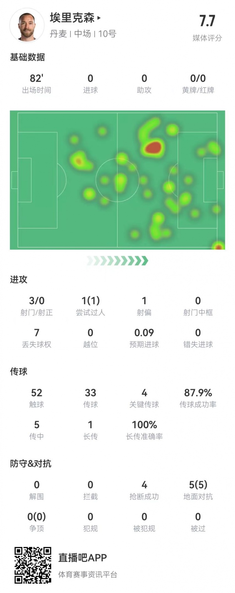 埃里克森本场数据:4关键传球+4拦截 5对抗均成功 获评7.7分