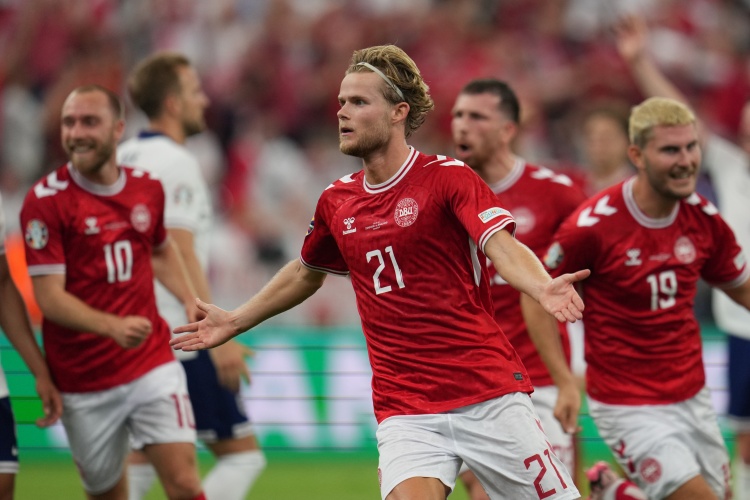 06月21日讯 欧洲杯小组赛C组第2轮,丹麦半场1-1英格兰,丹麦中场尤尔曼德轰出一脚28米世界波。24岁的尤尔曼德来自葡萄牙体育,据报道在欧洲杯前已经有曼联、热