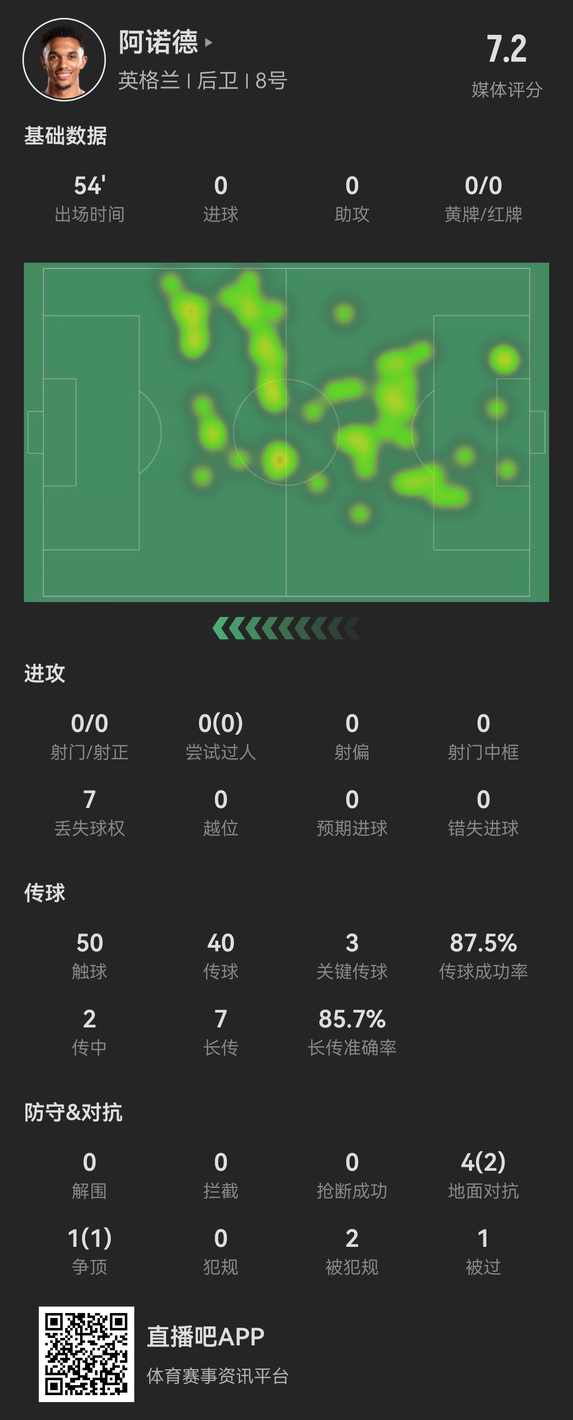 连续2场被换!阿诺德首发54分钟数据:传球成功率87.5%,7丢球权