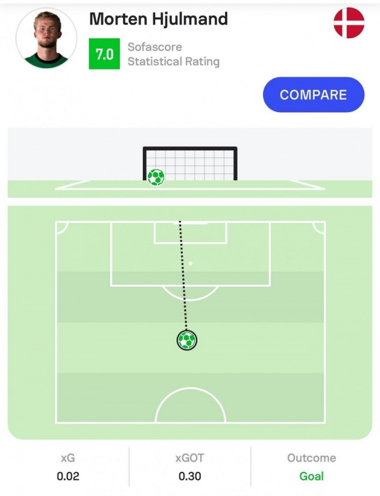 据统计,尤尔曼德这记距离球门28米的世界波的预期进球值仅0.02。