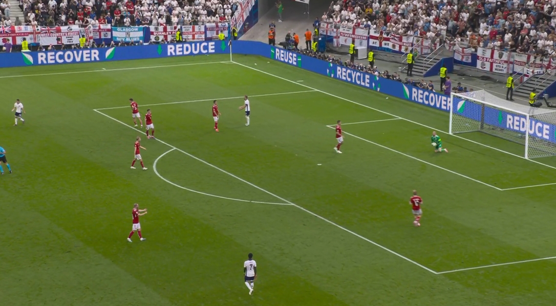 06月21日讯 英格兰vs丹麦第42分钟,福登中路突进来到禁区前沿,没有传球,选择直接打!打飞了!身前的凯恩摊手示意怎么不传我。