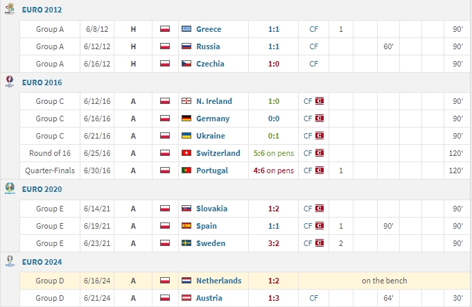 06月22日讯 欧洲杯D组小组赛第二轮战罢,波兰1-3奥地利,荷兰0-0法国。由于胜负关系劣势,波兰已经确定成为欧洲杯第一支出局球队。本届欧洲杯是波兰头号球星莱