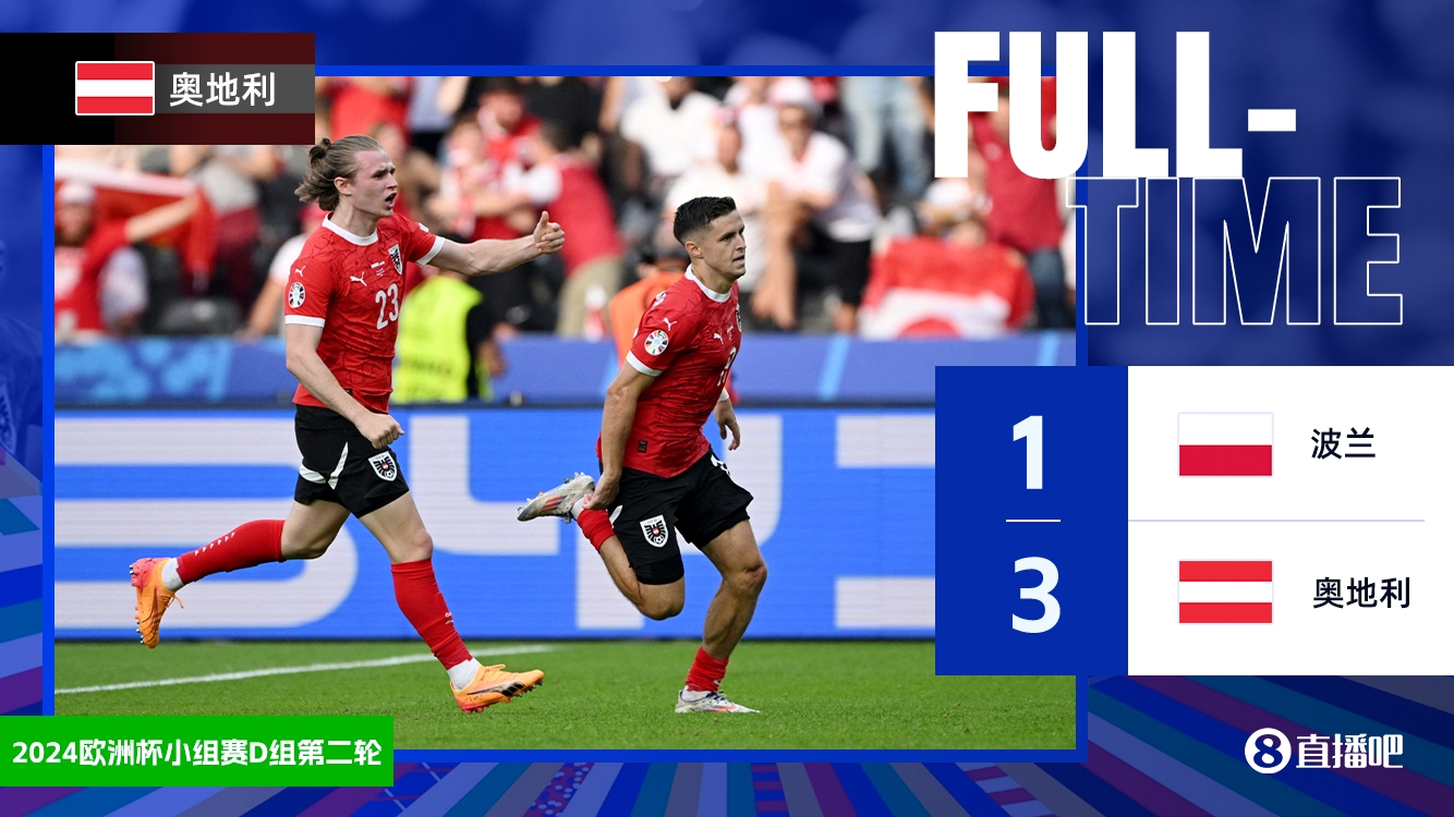 波兰1-3负奥地利,波兰遭遇两连败,球队将在末轮对阵法国。