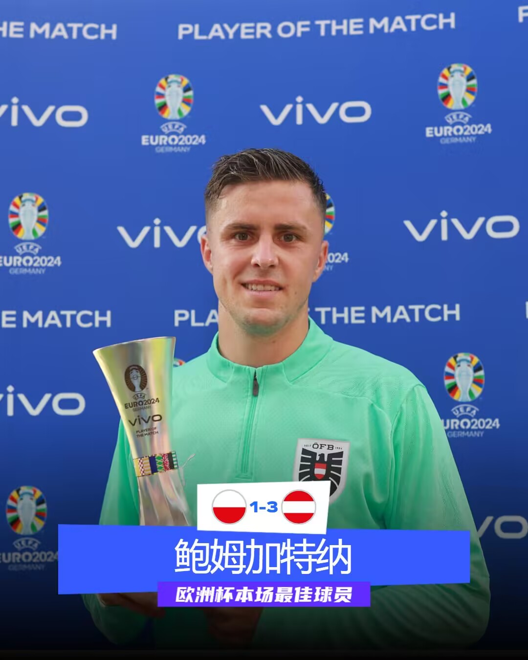 欧洲杯小组赛D组第2轮,波兰1-3奥地利。奥地利前锋鲍姆加特纳当选欧足联官方的本场最佳球员。