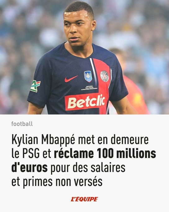 《队报》消息,姆巴佩正式向巴黎发函,索要拖欠的1亿欧工资和奖金。