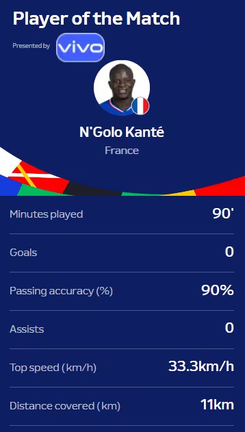 欧洲杯小组赛D组第2轮,荷兰0-0战平法国。坎特连续两场当选全场最佳球员。