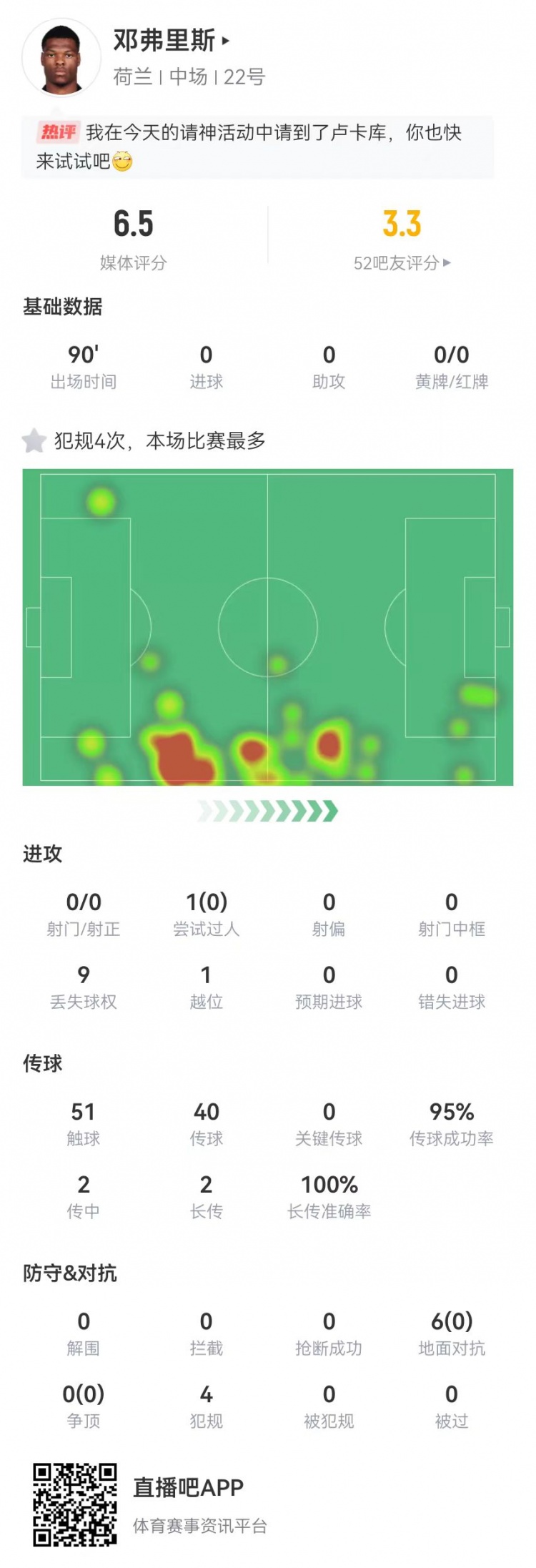 战犯!邓弗里斯防守端挂零+6对抗失败+4犯规+1致命越位 6.5分最低