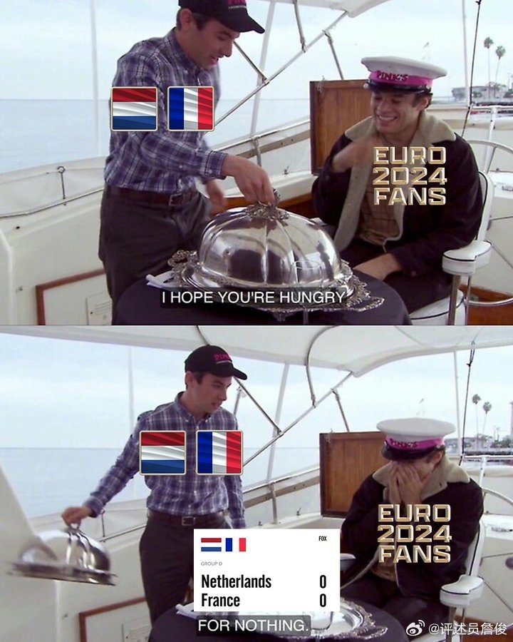 欧洲杯小组赛D组第二轮焦点战,荷兰0-0战平法国。詹俊在社媒用一张图点评了本场比赛。