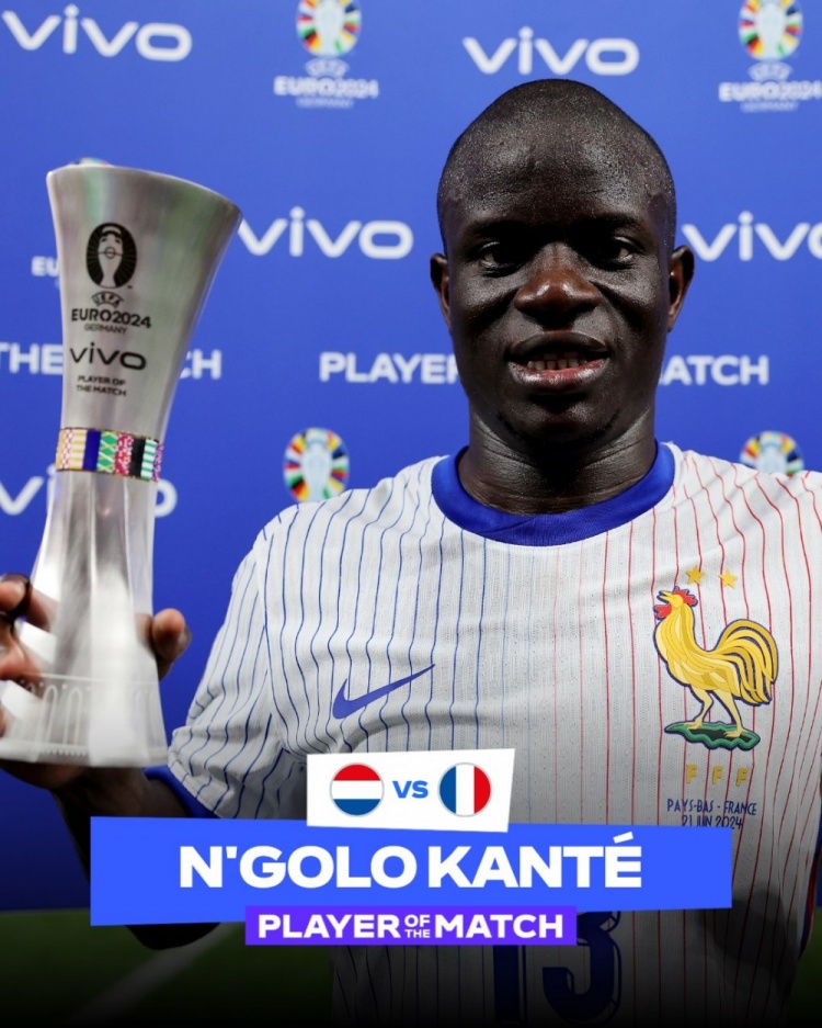 6月22日讯 欧洲杯小组赛D组第2轮,法国0-0战平荷兰,坎特赛后当选全场最佳球员,连场获评MVP。