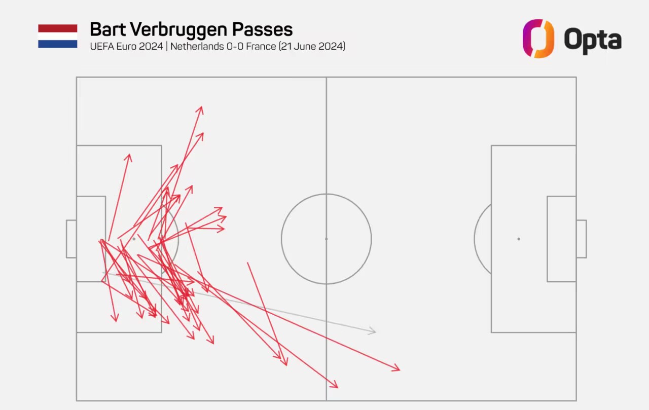 据OptaJohan数据统计,本场比赛荷兰门将维尔布鲁根传球成功率为97.5%(39/40),这是自1980年以来,欧洲杯单场比赛至少40次传球的门将中,最高的传球成功率。