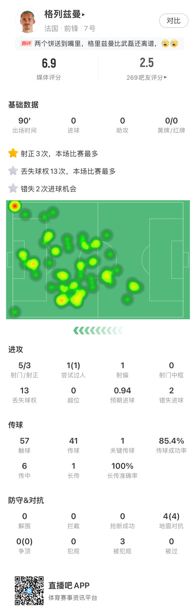 状态不佳!格列兹曼全场数据:2次错失进球,13次丢失球权最多