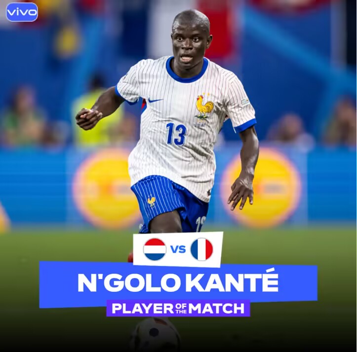 6月22日讯 欧洲杯小组赛D组第2轮,荷兰0-0战平法国。赛后,33岁的坎特连续2场当选全场最佳球员,坎特全场贡献2次抢断,3次关键传球,传球成功率90%。