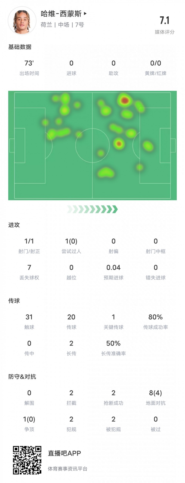 哈维-西蒙斯本场数据:1射正,1次关键传球,2拦截2抢断,评分7.1