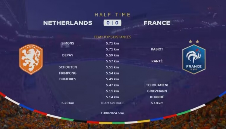 荷兰全队平均跑动距离5.20公里,法国全队平均跑动距离5.18公里。