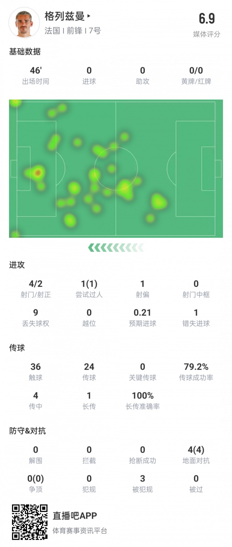 格列兹曼半场数据:4次射门2次射正,错失1次良机
