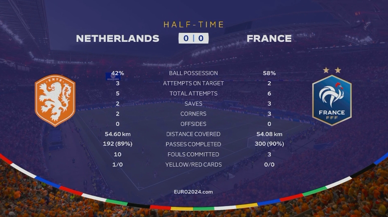 荷兰vs法国半场数据:射门5-6、射正3-2,犯规10-3