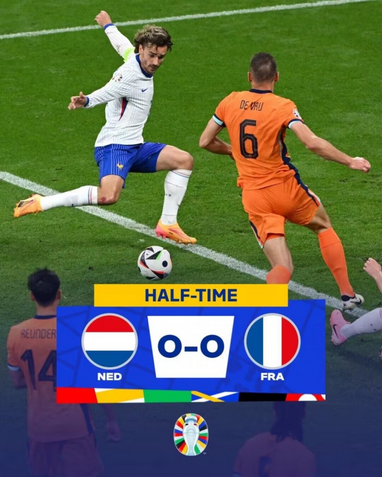 6月22日讯 北京时间凌晨3:00,欧洲杯小组赛D组第二轮焦点战,荷兰vs法国。上半场,弗林蓬开场造险;格列兹曼失空门;小图拉姆失单刀。