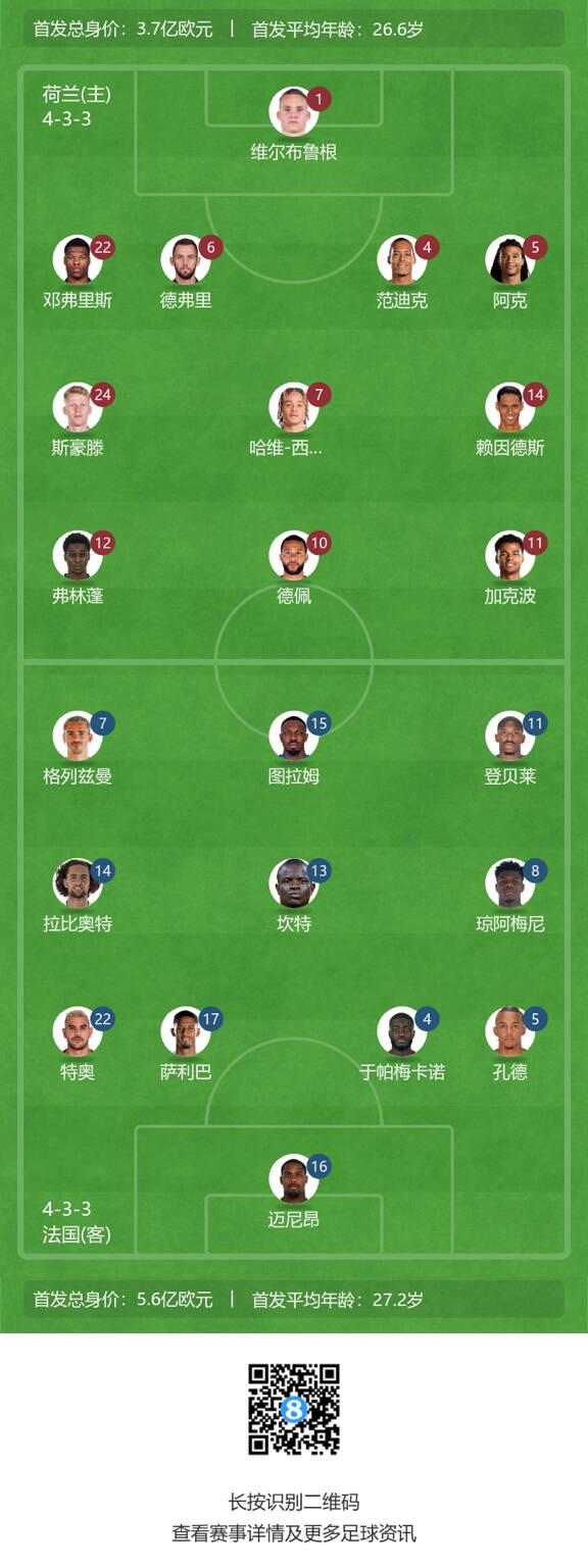 ⚔️姆总替补!荷兰vs法国首发身价对比:3.7亿欧vs5.6亿欧